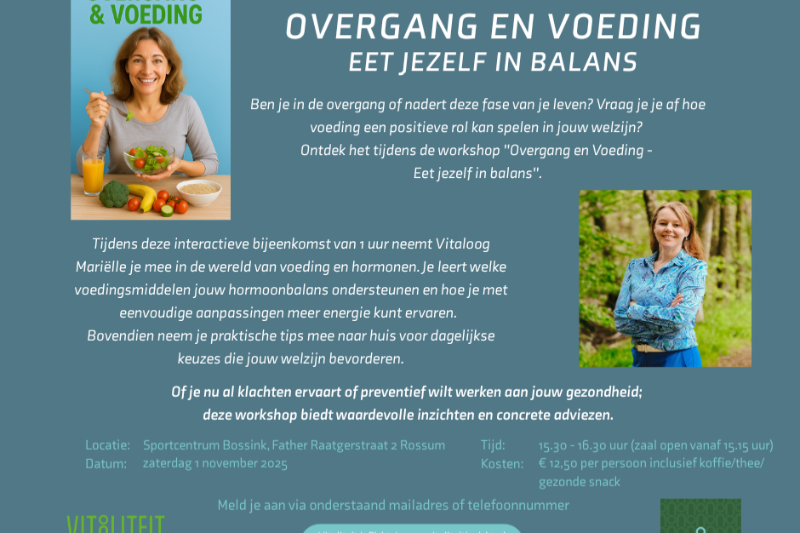 Op 1 november om 15.30 uur geef ik een interactieve workshop bij Sportcentrum Bossink over de invloed van voeding op jouw welzijn tijdens de overgangsperiode.